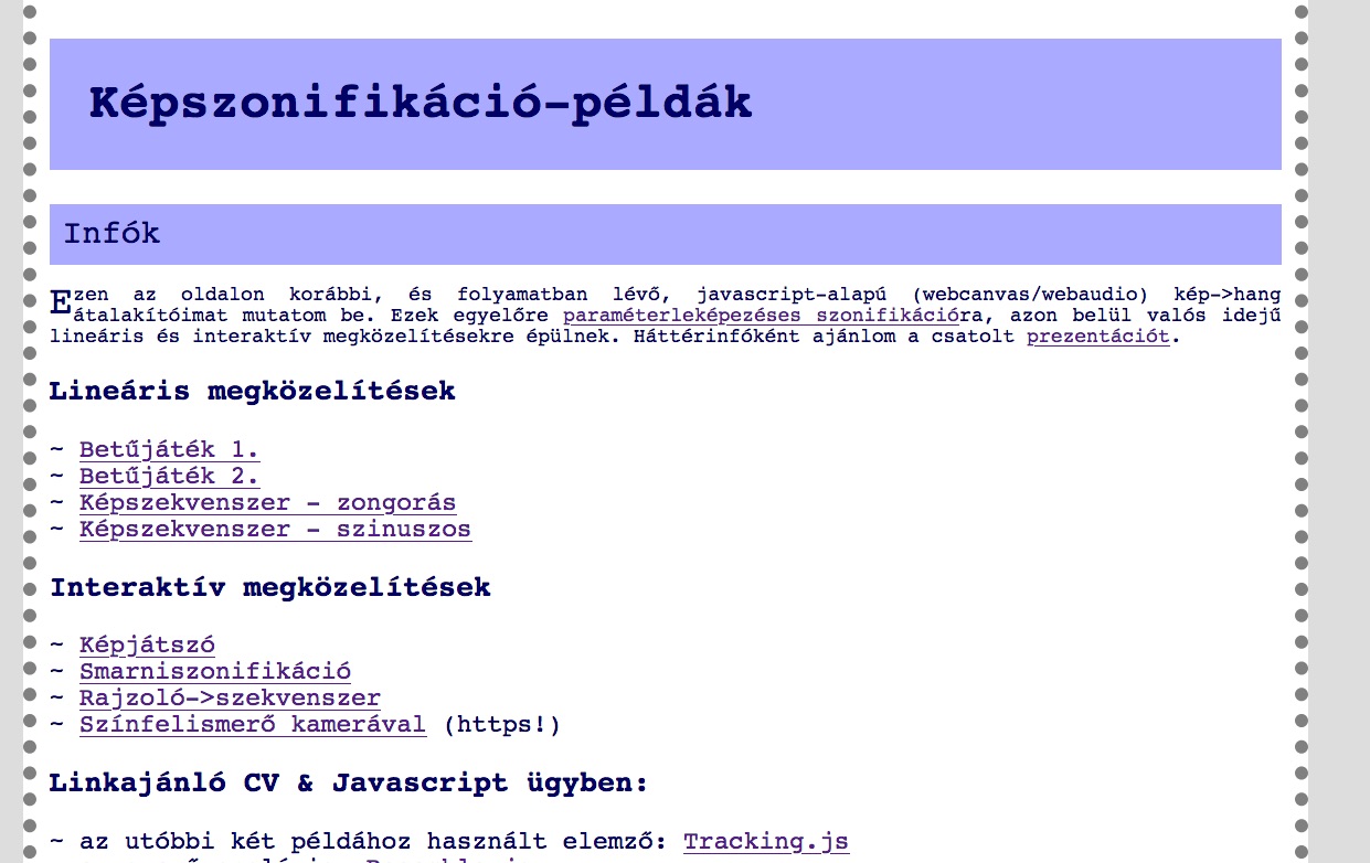 Ezen az oldalon korábbi, és folyamatban lévő, javascript-alapú (webcanvas/webaudio) kép->hang átalakítóimat mutatom be. Ezek egyelőre paraméterleképezéses szonifikációra, azon belül valós idejű lineáris és interaktív megközelítésekre épülnek. Háttérinfóként ajánlom a csatolt prezentációt.